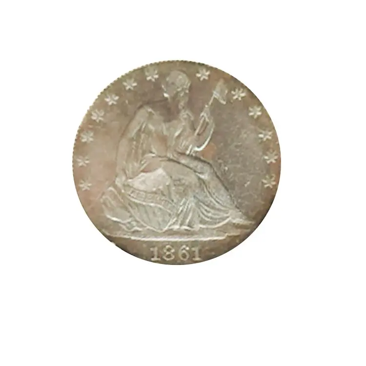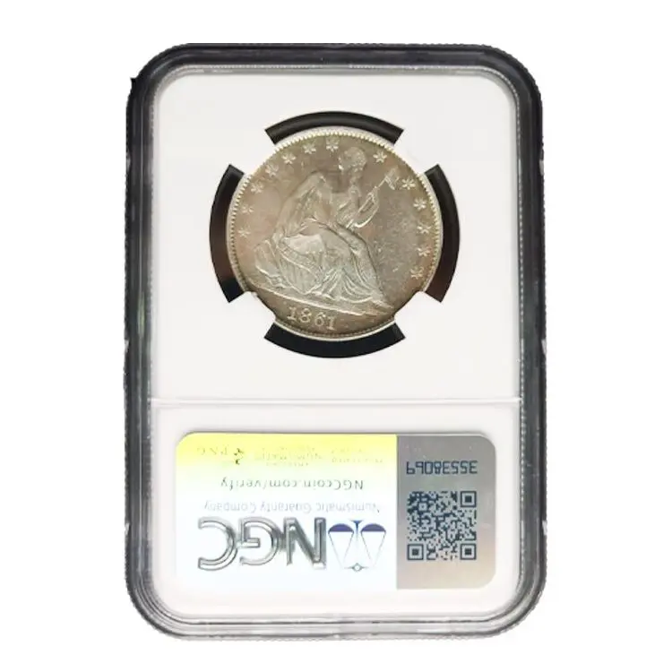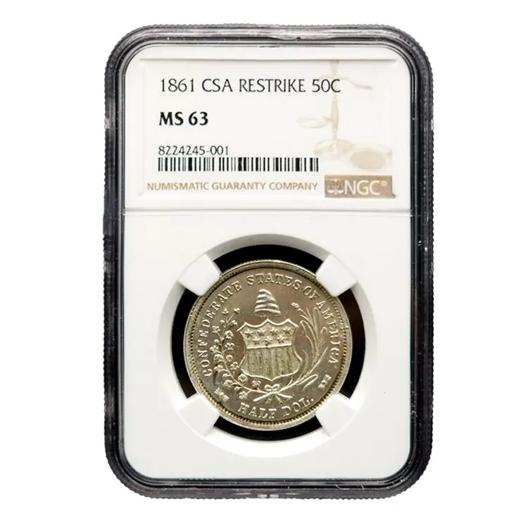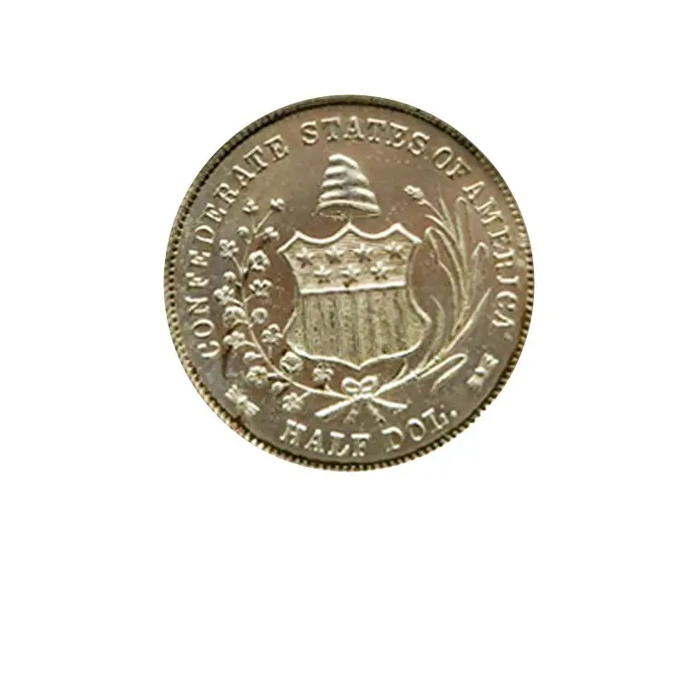 Extremely rare 1861 Confederate States of America half dollar, which is considered one of the rarest Confederate coins due to only four original pieces ever being minted; the original dies and strikes are now lost, making this restrike a replica based on the original design, using the standard “Seated Liberty” obverse from a regular 1861 U.S. half dollar and the unique Confederate reverse design