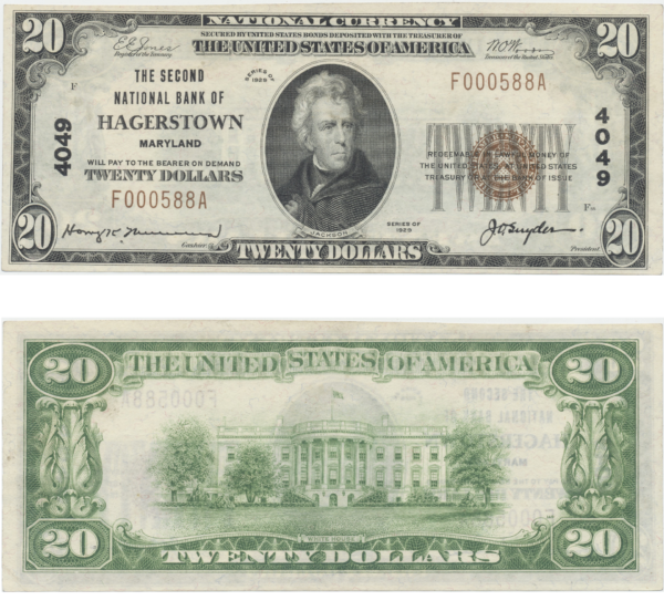 1929 $20 The Second National Bank of Hagerstown, Maryland. Charter # 4049