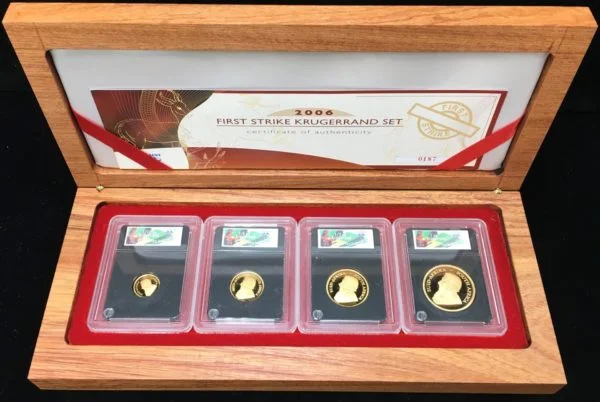 2006 South Africa 4-Coin Gold Krugerand Proof Set First Strike with COA. These Sets are labeled First Strike by the South African Mint. Comes in original box from the mint with certificate of authenticity. Obverse: Displays the likeness of Paul Kruger, South Africa’s first and only president, along with “South Africa” in Afrikaans and English. Reverse: Along with the year of minting and Gold weight, the image of the national animal of South Africa, a Springbok antelope, is featured.